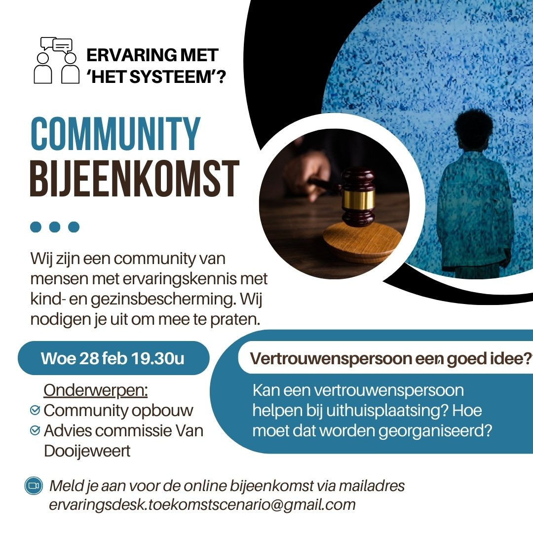 Wij zijn een nieuwe community van mensen met ervaringskennis met kind- en gezinsbescherming. Heb jij ook ervaring met 'het systeem'? Wij nodigen je uit om mee te praten via Zoom op woensdag 28 februari 19.30-21 uur. Deze keer gaat het over het advies van de commissie van Dooijeweert.