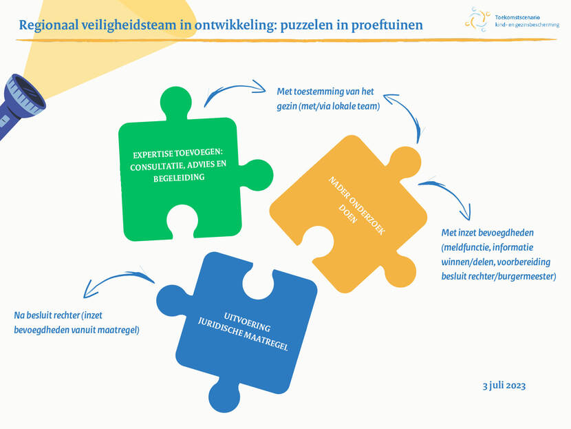 Vanuit het programma Toekomstscenario kind- en gezinsbescherming werken 11 regionale proeftuinen aan specifieke uitvoeringsvraagstukken. Eén daarvan is het nieuw op te richten regionaal veiligheidsteam waarin functies van de Gecertificeerde Instellingen, Veilig Thuis en Raad van de Kinderbescherming samenkomen. De proeftuinen experimenteren op verschillende manieren met de nieuwe opdracht van het regionaal veiligheidsteam. Hierbij staat de vraag centraal: Hoe geven we met de werkwijze van het regionaal veiligheidsteam invulling aan de uitgangspunten van het Toekomstscenario: gezinsgericht, rechtsbeschermend & transparant, eenvoudig en lerend?